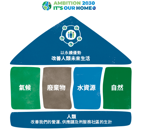 我們在營運及供應鏈,大幅減少溫室氣體的淨排放量,以實現我們的零排放目標。就我們營運及供應鏈的任何剩餘排放量,我們亦會透過自然或技術解決方案的推動,以抵消等量的溫室氣體排放量。為了加快實現 2040 年淨零排放,我們先為 2030 年訂立多個以科學為本的短期目標。